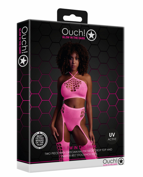 Трусики с чулками + топ "Ouch Glow In The Dark" розовый неон, XS/XL